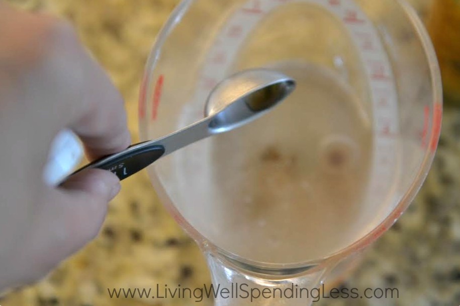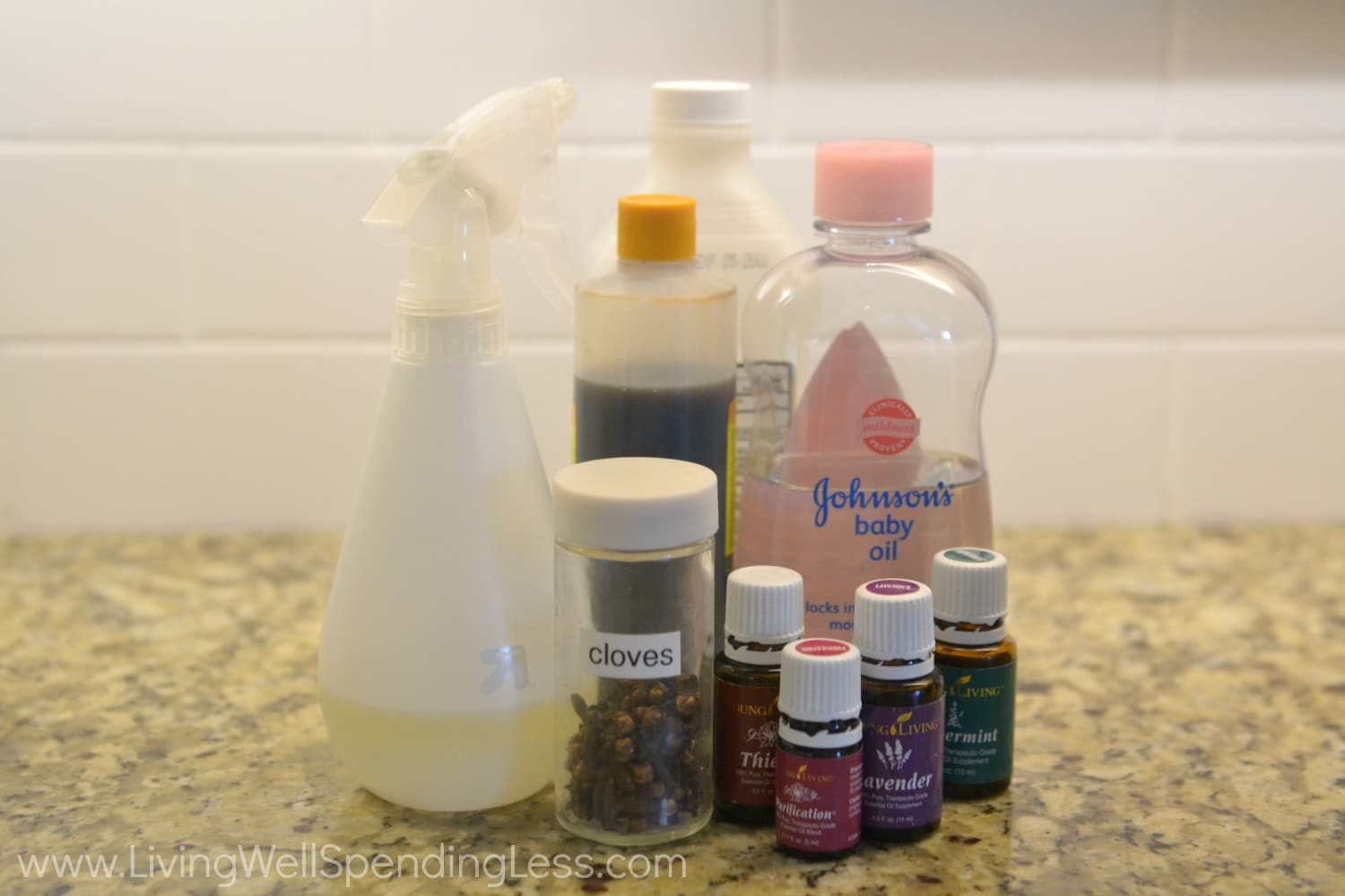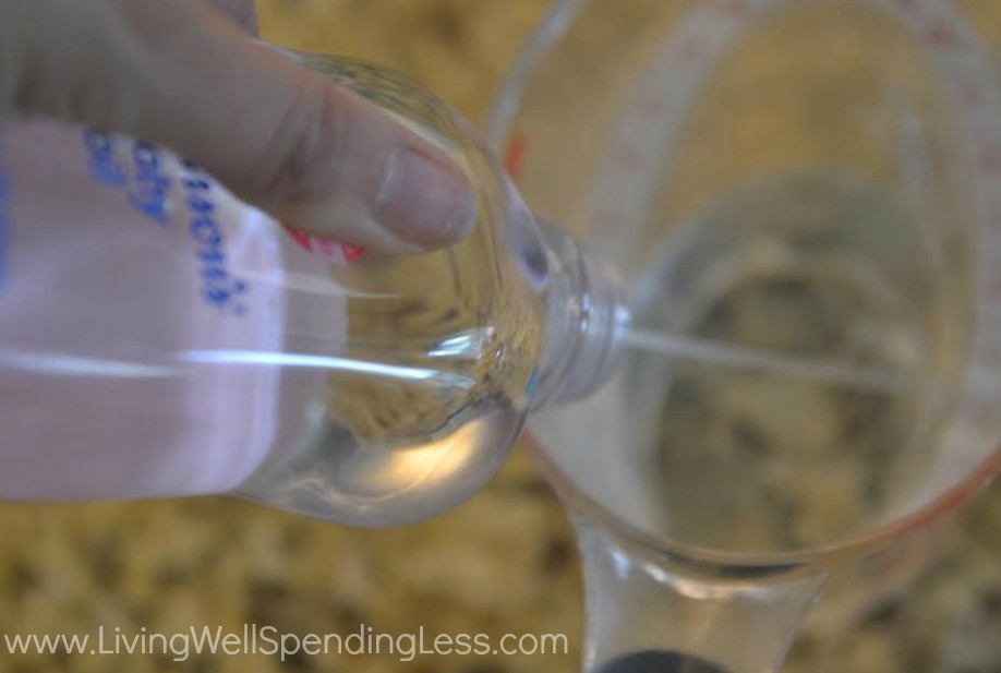 witch hazel baby oil (If you prefer not to use baby oil, keep in mind that olive oil or grape seed oil will work too, but the baby oil has a particular scent that bugs don’t like.) vanilla extract assorted essential oils (for scent) whole cloves (optional) empty spray bottleStep 1: Measure 2/3 cup witch hazel into measuring cup.
