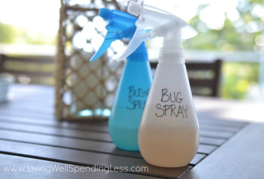 Step 6: Carefully pour homemade bug repellent mixture into an empty spray bottle. Be sure to label bottle! Shake well before using. Apply liberally to skin to keep bugs away.